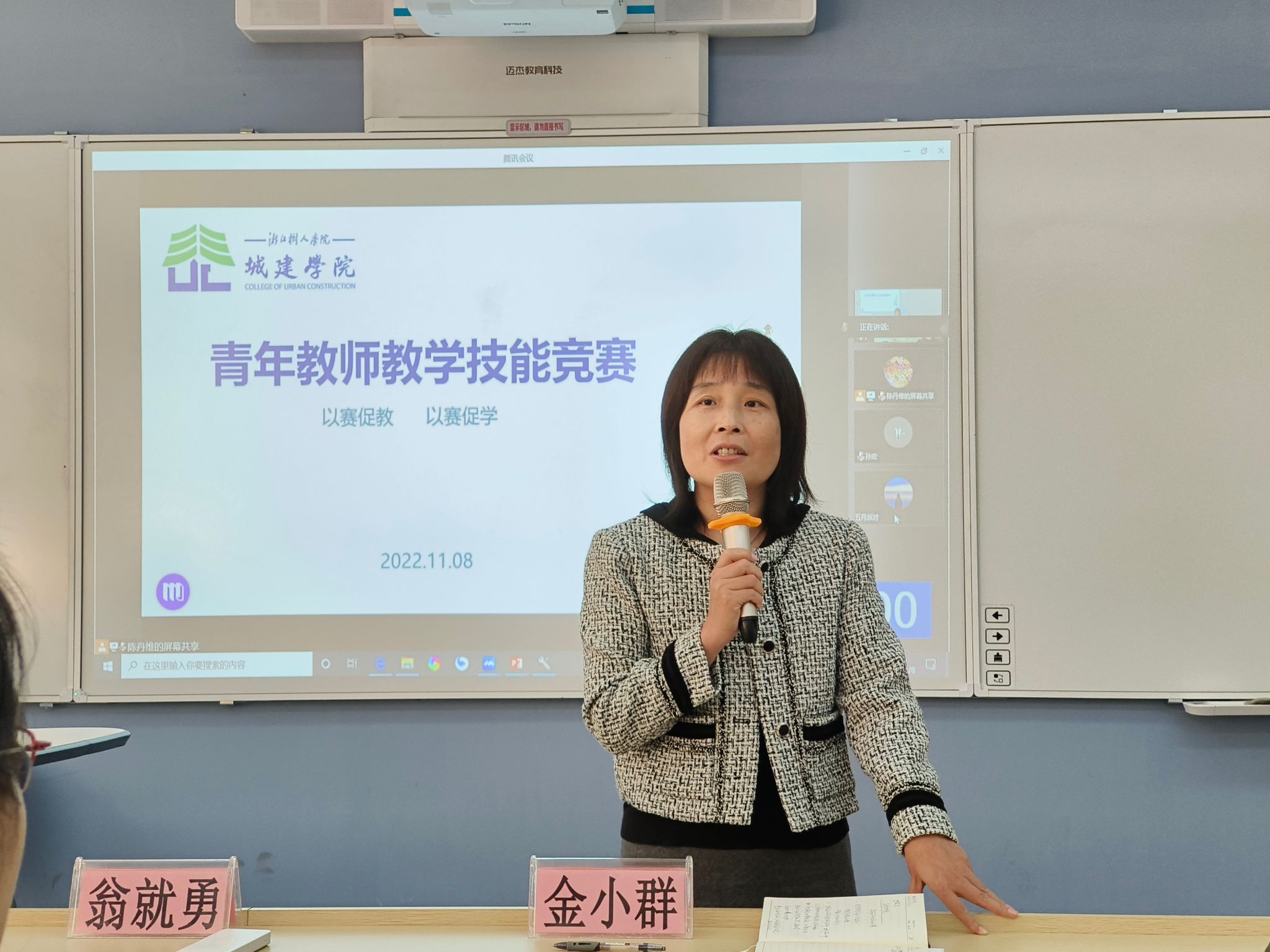 本次竞赛同时开放了线下和线上观摩方式,校教学质量监控中心主任张绣望、学院常务副经理金小群、党委副书记翁就勇来到现场为参赛老师加油助威,未能到场的老师则齐聚云端观摩助阵,此次活动由教学副经理陈丹维主持。