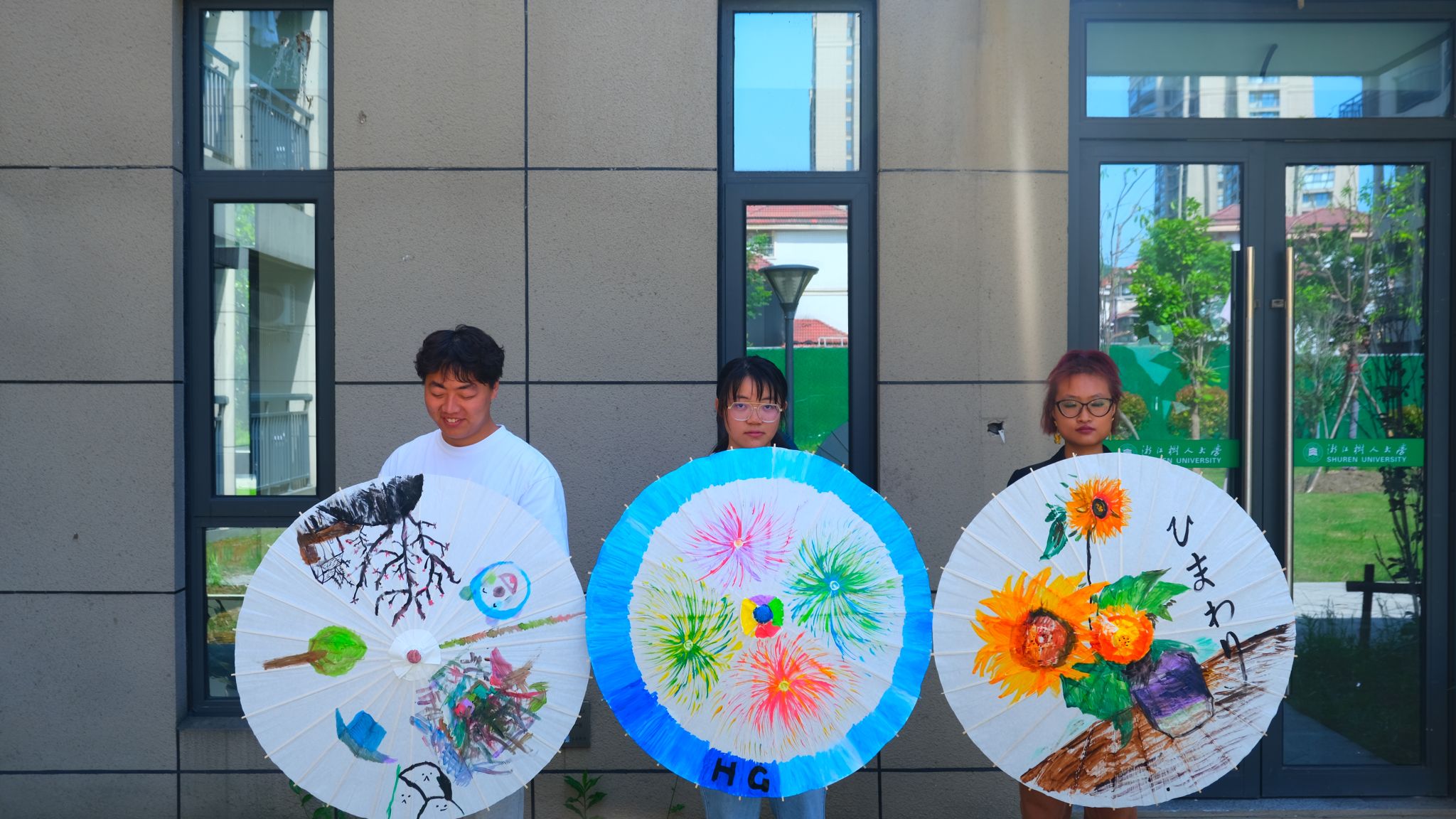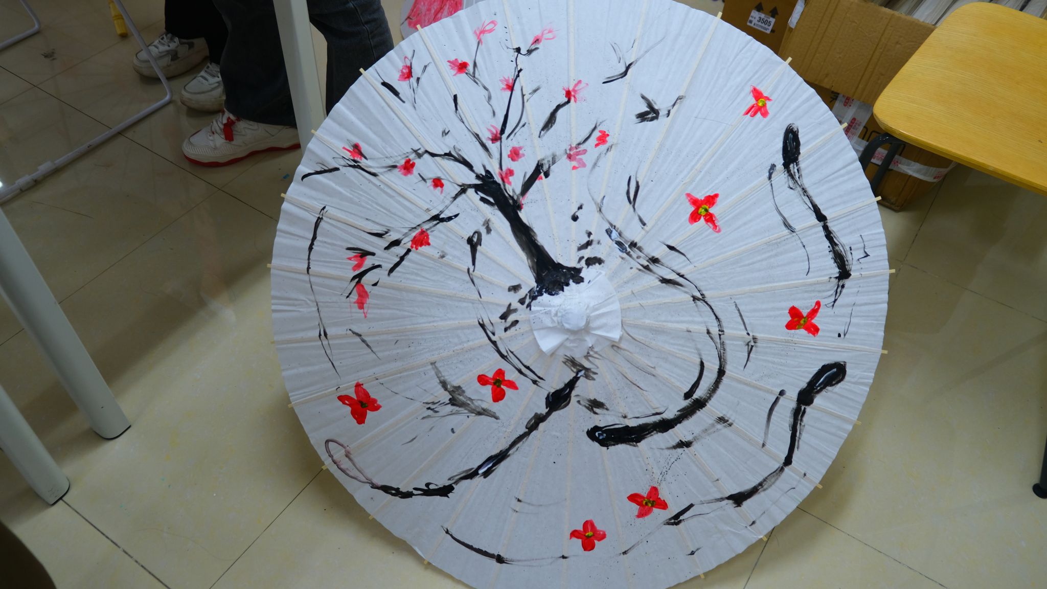 一柄柄有待上色的油纸伞等待着它的有缘人,也将活动氛围拉至古典时代油纸伞下的浪漫情怀中。同学们迫不及待地选取自己中意的油纸伞,挽起袖口提起画笔,发挥自己的想象力,一笔一画,一彩一韵,把自己的所念所想通过画笔呈现在伞面上,绘制出自己心中的那份浪漫。每一个作品都是那么独特,那么独一无二,每一笔每一画都倾注了自己的心血。