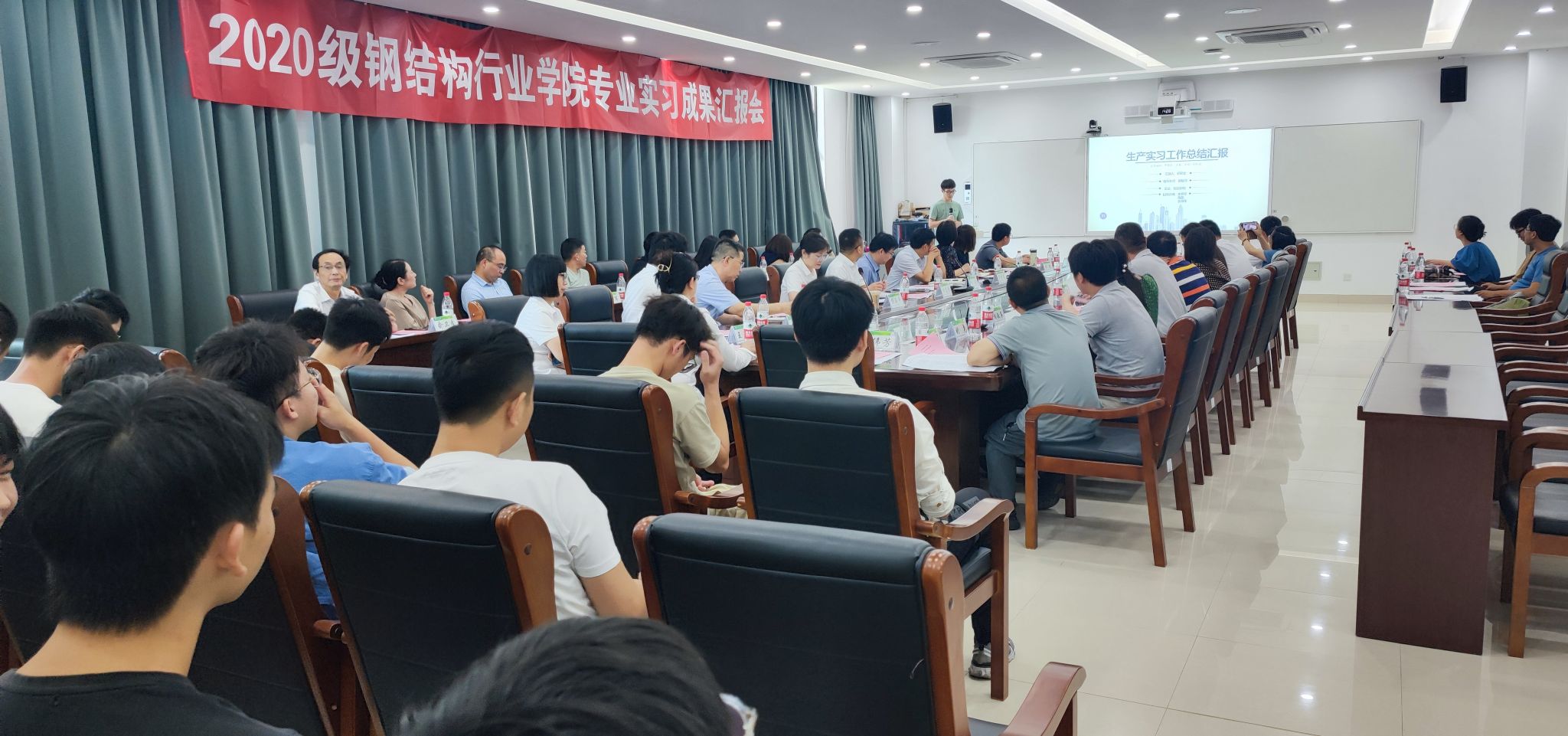 本次专业实习为期14周,钢结构行业学院学员共31人分组进入钢结构企业一线岗位进行轮岗实习。这是钢结构人才培养模式“2.5+0.5+0.5+0.5”中的“0.5”之一,员工在大三下的时候进入企业真实岗位进行轮岗实习,每位员工都配备企业指导教师和校内指导教师全程进行跟踪,通过实习,为员工打通了从课堂到工地、工厂、设计部门等的通道,提前接触工作岗位,融入企业。10位优秀员工代表分别从企业特色、实习安排、实习心得、未来规划等方面进行了汇报。员工从生产车间到项目部、设计部、质检部等多部门进行轮岗,从生产基地了解焊接工艺到现场施工管理,从现场物料统计到质量监控……全流程的参与,多角色的转换,让员工不仅在专业知识与技能上得到了极大的锻炼,也在沟通交流、学习动力等软实力上获得了长足的进步,认可企业文化的同时也对自我的规划有了更具体的认知。