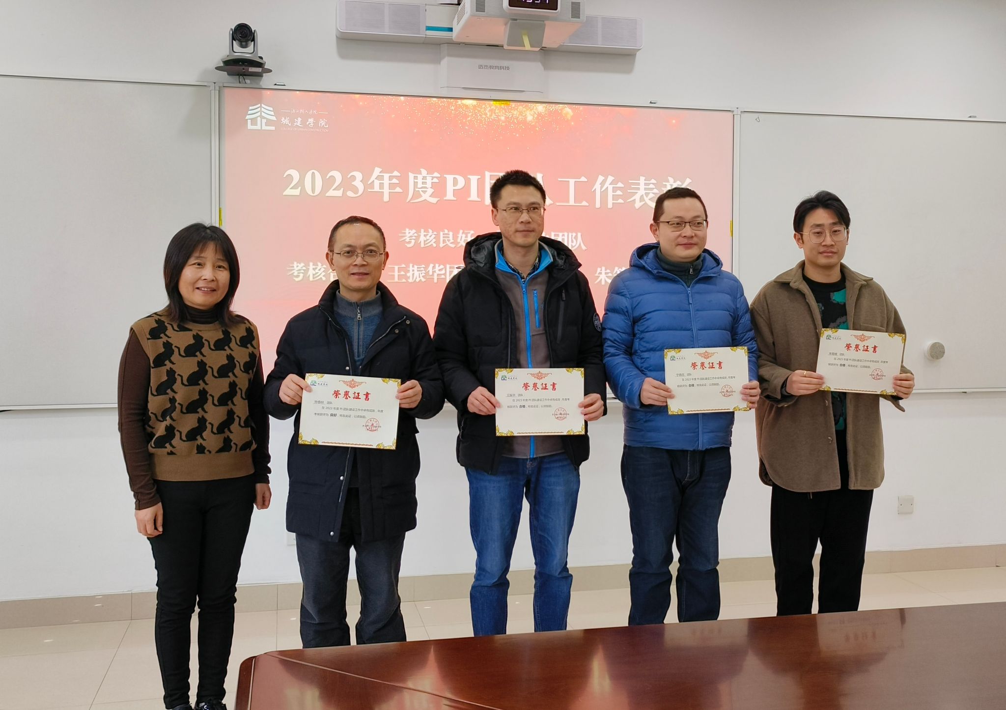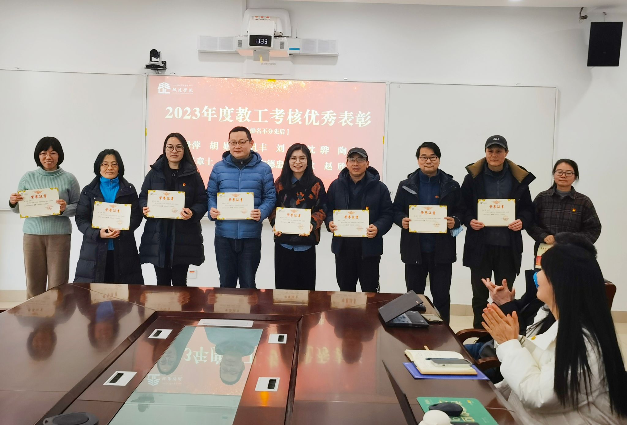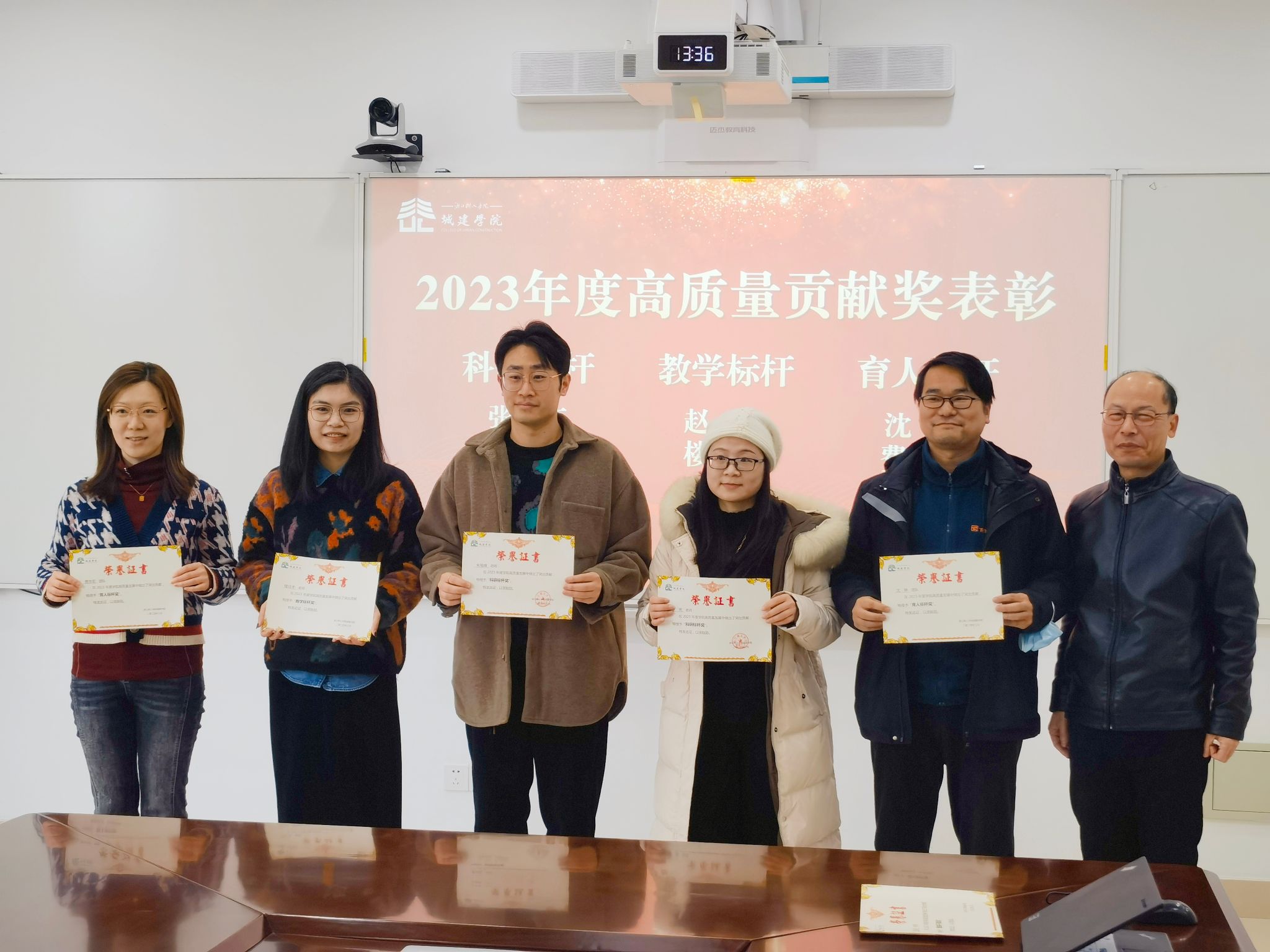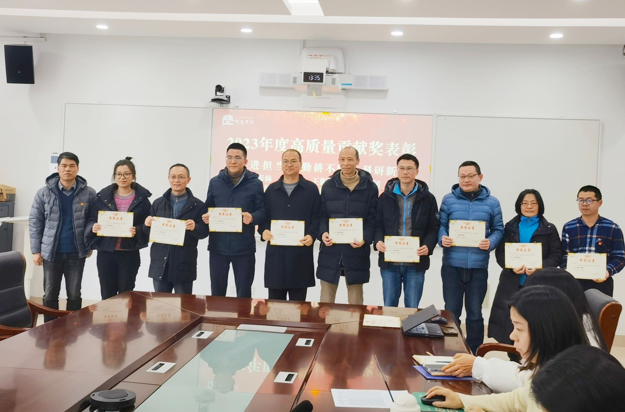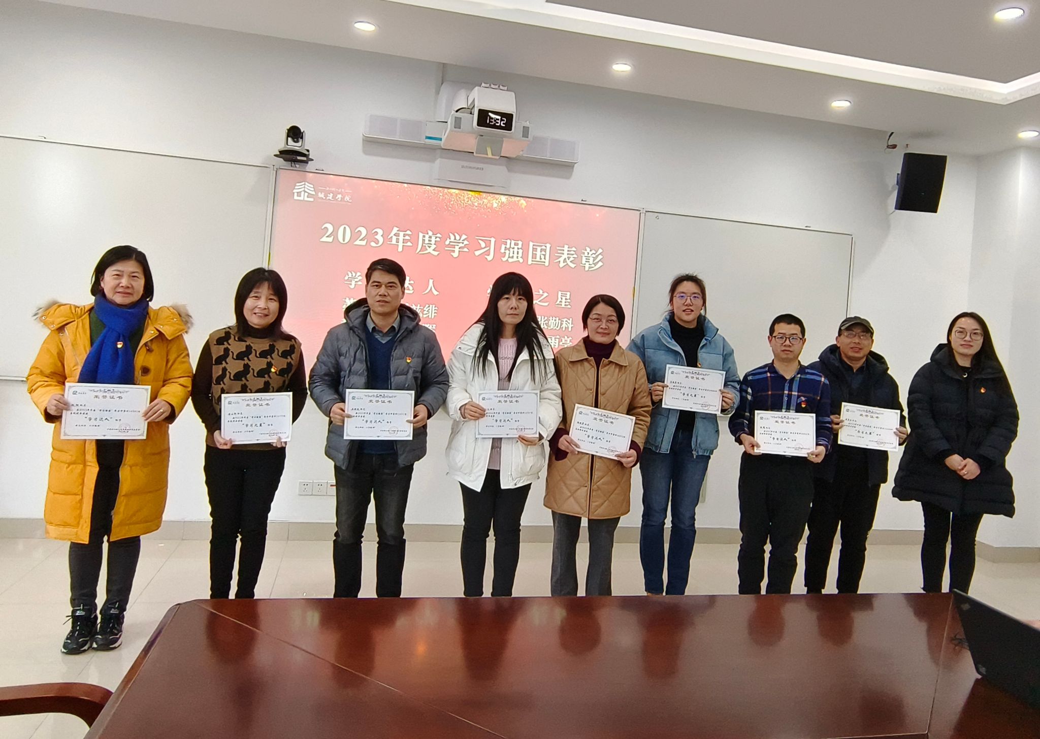 随后,常务副经理金小群宣读了2023年度“学习强国”“年度教工考核”“高质量发展贡献”等各项荣誉表彰文件,王军书记和学院领导班子成员为获奖优秀团队和先进个人颁发了荣誉证书。