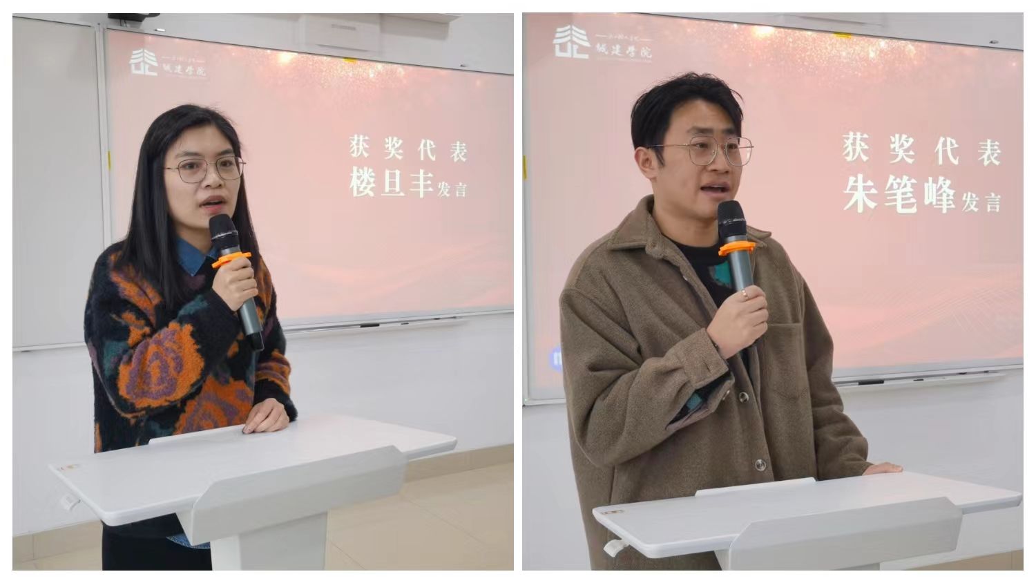楼旦丰副教授、朱笔峰副教授作为获奖教师代表发言。两位老师分享了各自在教研工作上的感悟和体会,倾诉了对学校和学院的感激深情,并表达了心怀敬畏、不忘初心、关爱员工,把工作当作毕生事业认真经营,把课程当作毕生作品用心打磨,立足岗位再建新功的决心。