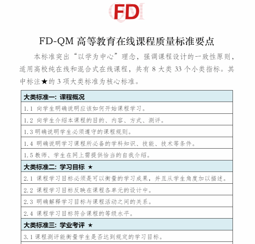 FD-QM高等教育在线课程质量标准由复旦大学与QM机构合作研究开发而成,是既能与国际标准实质等效、又能解决中国高等教育问题的质量标准。FD-QM标准设有“课程活动与员工互动”等8个大类、33个二级指标,突出“以学为中心”理念,强调课程设计的一致性原则。2018年6月,FD-QM高等教育在线课程质量标准联盟在复旦大学成立,并于2020年12月推出FD-QM标准第二版,为高校建设国家一流混合在线课程提供支持。