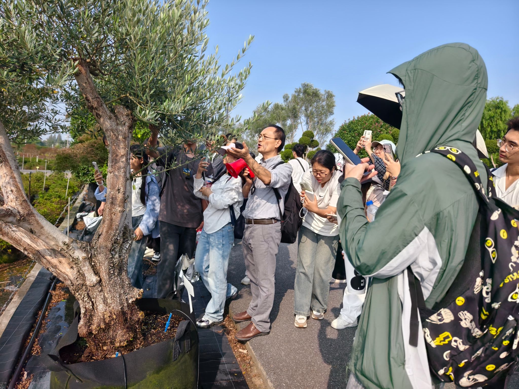 (图1 风景园林绍兴市重点专业负责人、园林花卉学核心课程负责人钟泰林教授在虹越花卉海宁基地讲授“油橄榄”引种与栽培)